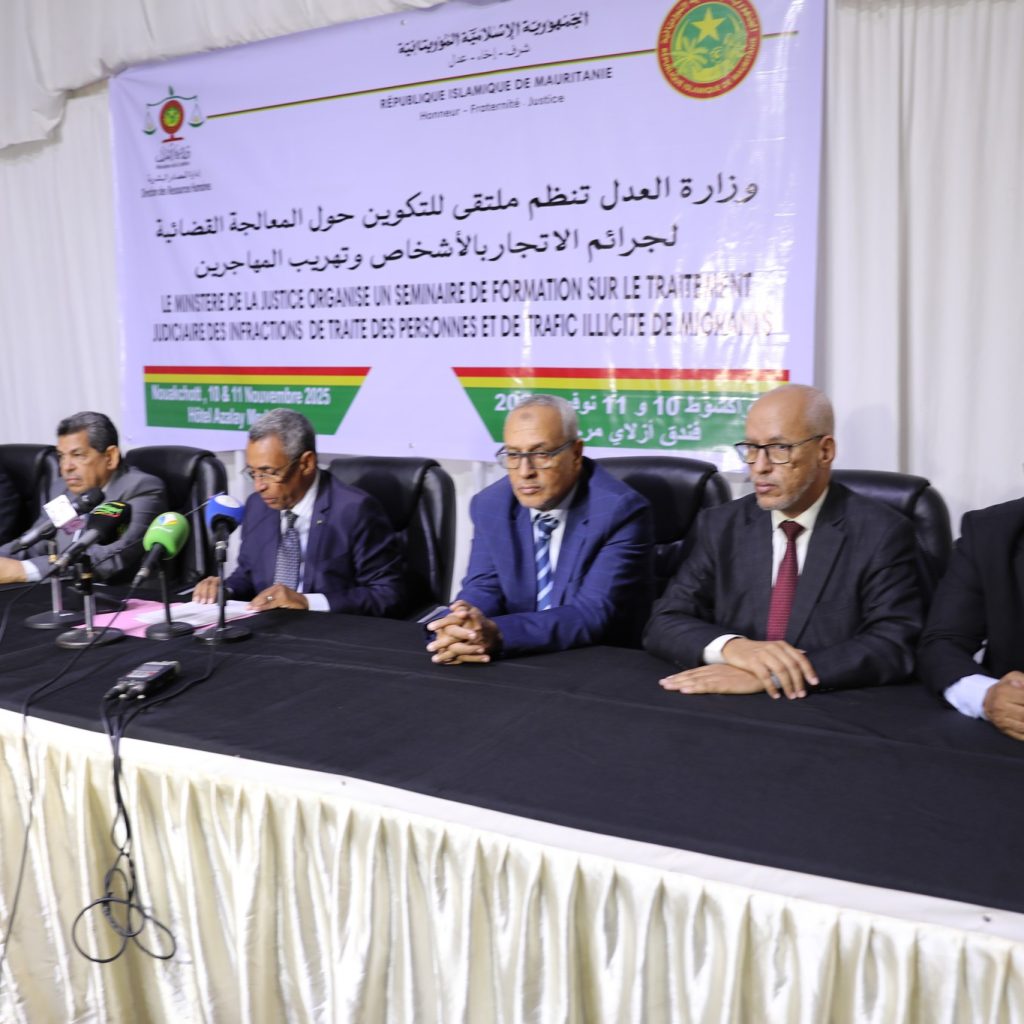 افتتح الأمين العام لوزارة العدل السيد: محمد أحمد عيده صباح اليوم الإثنين بانواكشوط، فعاليات ملتقى تكويني تحت عنوان: المعالجة القضائية لجرائم الاتجار بالأشخاص وتهريب المهاجرين.