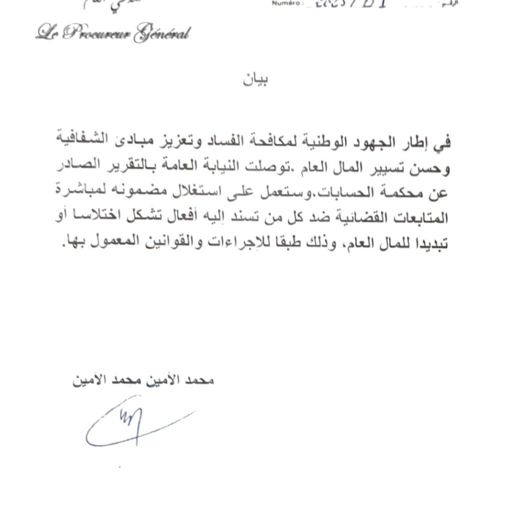 ا«في آطار الجهود الوطنية لمكافحة الفساد وتعزيز الشفافية وتحسين تسيير المال العام٬ توصلت النيابة العامة بالتقرير الصادر عن محكمة الحسابات٬ وستعمل على استغلال مضمونه لمباشرة المتابعات القضائية ضد كل من تسند إليه أفعال تشكل اختلاسا أو تبديدا للمال العام وذلك طبقا للإجراءات والقوانين المعمول بها». ا